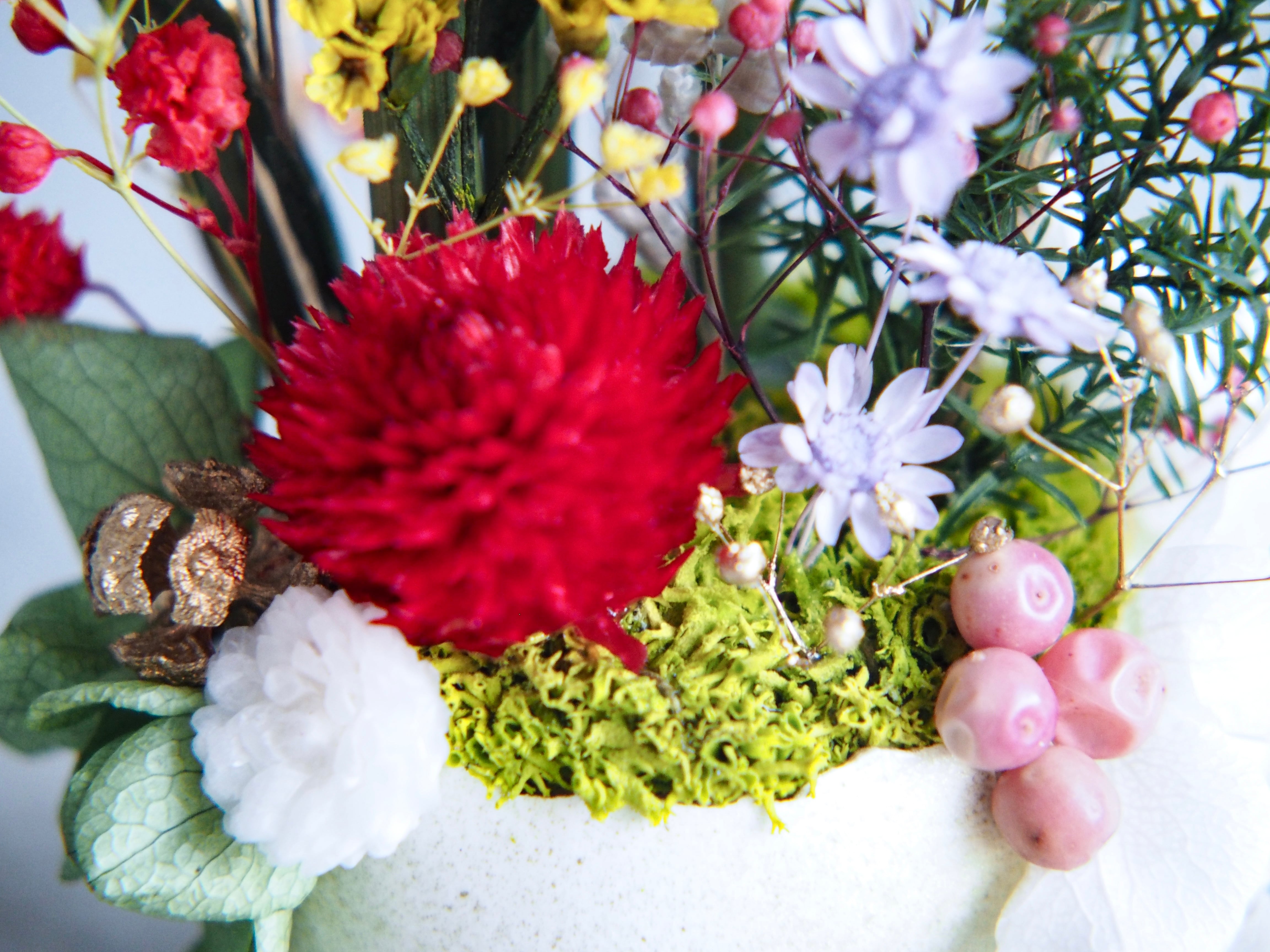 使用花材:トクサ(緑)、センニチコウ(赤)、リモニウム(黄色)、ブリーザ(濃いピンク)、ヒノキの実(金)、あじさい(白/エメラルドグリーン)、ティーツリー(緑)、ラベンダー(紫)、ユーカリの葉(金)、スターフラワー(黄緑/紫)、イモーテル(白)、ペッパーベリー(ピンク)、ヒムロスギ(緑)、かすみ草(金/銀/ピンク)